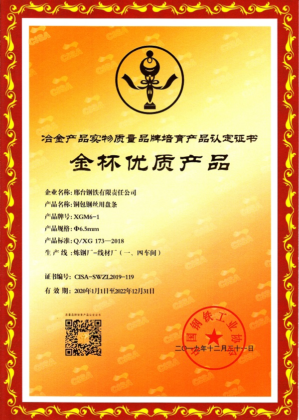 邢鋼銅包鋼絲用盤條XGM6-1 φ6.5mm規(guī)格獲冶金產(chǎn)品實物質(zhì)量金杯優(yōu)質(zhì)產(chǎn)品認定證書