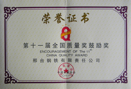 2011年10月,邢鋼榮獲“第十一屆全國質(zhì)量獎(jiǎng)鼓勵(lì)獎(jiǎng)”。