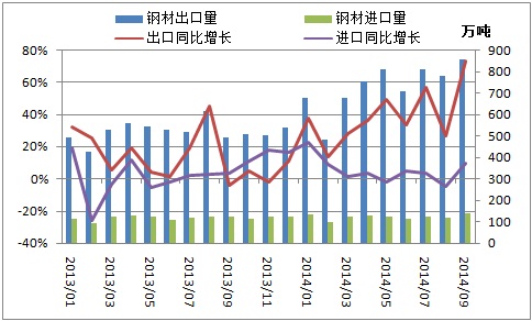 2014年9月我國出口鋼材852萬噸,創(chuàng)下歷史新高,同比大增73.2%。一方面,上年同期基數較低,導致9月鋼材出口同比增速上升明顯。另一方面,9月我國鋼材出口均價加速下跌,國際競爭優(yōu)勢明顯,進一步刺激鋼材出口。當月鋼材出口均價739美元/噸,環(huán)比下降4.9%,同比下降10.7%。