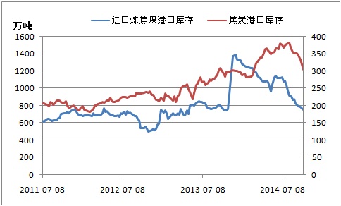 圖二:焦炭、焦煤港口庫存走勢