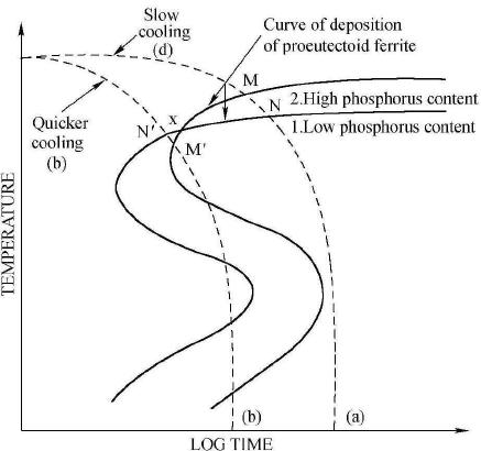 上圖曲線1、2分別是高P鋼、低P鋼的恒溫轉變曲線,也可以分別表示同一鋼中高P區(qū)和低P區(qū)的恒溫轉變曲線。在控制冷卻速率較慢的情況下,如曲線(a)所示,鐵素體將會先在M點形核。因為P能夠提高C的活度系數,所以高P區(qū)域C的活度較高,但實際濃度卻偏低,鐵素體的形核時會推動C元素向低P區(qū)域、原本C濃度高(活度低)的區(qū)域擴散,這樣就會造成C元素偏聚,形成帶狀組織;如果冷卻速率較快,如(b)所示,鐵素體會先在Nˊ點(低P區(qū))形核,促進C元素向高P區(qū)域、原來C濃度較低的區(qū)域擴散,會使C分布的更加均勻,鐵素體和珠光體都會隨機形核長大,減弱或抑制帶狀組織形成。