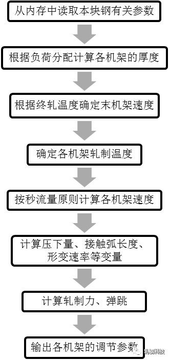 圖1所示為精軋設(shè)定模型計算原理圖的主要思路,不代表編寫程序所用的細框圖,因此只是展現(xiàn)了大概的計算流程,看圖可以初步了解精軋設(shè)定模型的大致控制思路。