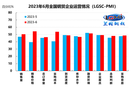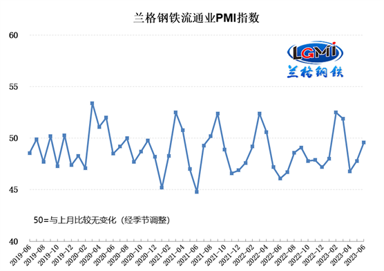 蘭格鋼鐵網(wǎng)統(tǒng)計發(fā)布的2023年6月份鋼鐵流通業(yè)PMI總指數(shù)為49.6%,比上月上升1.8個百分點,在收縮區(qū)間內繼續(xù)回升。從分類指數(shù)看,構成鋼鐵流通業(yè)PMI的10個分類指數(shù)6升3降1平,其中銷售量、銷售價格、總訂單量、采購成本、走勢判斷和采購意愿6項指數(shù)上升,到貨速度、庫存水平和融資環(huán)境3項指數(shù)下降,企業(yè)雇員1項指數(shù)持平。